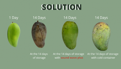 ตู้ปล่อยคลื่นเสียงความถี่สูงเพื่อชะลอการสุกของผลไม้สดประเภท climacteric มีขนาดความกว้าง 76 เซนติเมตร ยาว 106 เซนติเมตรและสูง 133 เซนติเมตร โดยที่ 1 ตู้สามารถบรรจุได้ประมาณ 300 กิโลกรัมต่อรอบ และสามารถเพิ่มปริมาณเป็น 10 ตันต่อรอบได้เมื่อออกแบบให้มีขนาดความกว้าง 2.44 เมตร ยาว 6.05 เมตร และสูง 2.59 เมตร (เทียบจากขนาดและน้ำหนักมะม่วง ยาว 7 cm กว้าง 13.5 cm หนัก 380 g) ระยะเวลาในการเดินเครื่องนาน 6 ชั่วโมง/รอบ อัตราการใช้ไฟ 5.4 ยูนิต /รอบ โดยคลื่นเสียงความถี่สูงมีผลกับ RNA 2 ชนิดซึ่งเป็นยีนส์ที่ทำให้เกิดกระบวนการสุกตามธรรมชาติของผลไม้ประเภทบ่มสุกได้ (Climacteric fruit) ชนิดที่ 1 กลุ่ม MAD box gene เป็นตัวรับสัญญาณจากเอทิลีน ชนิดที่ 2 RNA ที่ใช้ในกระบวนการผลิตเอทิลีน ซึ่งคลื่นเสียงความถี่สูงจะเข้าไปยับยั้งกระบวนการของ RNA ทั้ง 2 ชนิดนี้ ทำสามารถชะลอการสุกของผลไม้ประเภทบ่มสุกได้โดยที่คุณภาพของผลไม้นั้นไม่เกิดการเปลี่ยนแปลง สามารถเก็บรักษาได้นาน 2 สัปดาห์