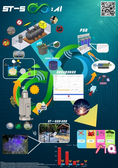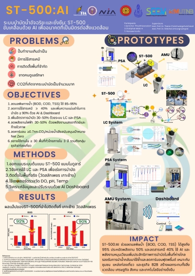 ผลงาน “ST-500:AI” เป็นระบบบำบัดน้ำเสียอัจฉริยะที่ผสานเทคโนโลยีไฟเบอร์ออปติกและปัญญาประดิษฐ์เข้ากับกระบวนการดูดซับก๊าซแบบสลับความดัน (PSA) เพื่อเพิ่มประสิทธิภาพการบำบัดและการดักจับคาร์บอนไดออกไซด์ ระบบสามารถกำจัดสารอินทรีย์ (COD >70%) และสารอาหาร (N, P >80%) พร้อมทั้งดักจับ CO₂ ได้มากกว่า 90% เพื่อนำกลับมาใช้ประโยชน์ในอุตสาหกรรมหรือเกษตรกรรม ผลงานนี้ช่วยลดพลังงาน ใช้ทรัพยากรอย่างคุ้มค่า และสร้างแนวทางการประยุกต์ใช้จริงเชิงพาณิชย์ในโรงงาน อุตสาหกรรม และชุมชนอย่างยั่งยืน