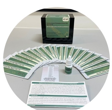 • ค่าความไว ต่อการวินิจฉัยโรคพยาธิใบไม้ตับ = 76.3 % • ค่าความไว ต่อการวินิจฉัยมะเร็งท่อน้ำดี = 86.0% • ค่าความจำเพาะ = 88.0% • สามารถอ่านผลตรวจด้วยตาเปล่าภายใน 15 นาที โดยไม่ต้องใช้เครื่องมือในห้องปฏิบัติการและไม่ต้องใช้ผู้เชี่ยวชาญเฉพาะ |