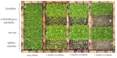ในผลผลิต รวมถึงส่งผลกระทบต่อสิ่งแวดล้อม และทำให้วัชพืชต้านทานสารเคมี การจัดการวัชพืชโดยชีววิธีที่ใช้จุลินทรีย์มีข้อจำกัดเรื่องประสิทธิภาพและการใช้งาน จึงมีการพัฒนาเทคโนโลยีชีวภัณฑ์กำจัดวัชพืช โดยใช้สารชีวภาพจากรา Lasidioplodia ร่วมกับสารเสริมประสิทธิภาพจากแบคทีเรีย ทำให้สามารถลดปริมาณการใช้สารสกัดหยาบจากเชื้อราได้ โดยชีวภัณฑ์นี้มีความเข้มข้นและประสิทธิภาพใกล้เคียงกับกลูโฟซิเนตแอมโมเนียมในตลาด มีความปลอดภัยต่อคนและสัตว์ ออกฤทธิ์แบบดูดซึมและสัมผัสตาย ควบคุมวัชพืชใบกว้างได้อย่างมีประสิทธิภาพ โดยมีวิธีใช้โดยการฉีดพ่นที่ความเข้มข้น 5 มก./มล. เพียง 1 ครั้ง สามารถควบคุมวัชพืชใบกว้างได้ผลตั้งแต่ 6 ชั่วโมงหลังฉีดพ่น และควบคุมได้อย่างสมบูรณ์ภายใน 7 วัน |