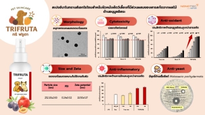 ผลิตภัณฑ์สเปรย์ทรานส์เอทโธโซมสำหรับผิวหนังสัตว์เลี้ยงที่ผสานสารสกัดจากพรุน ทับทิม และมะม่วง ภายใต้ชื่อ TRIFRUTA เป็นผลิตภัณฑ์ที่ช่วยเพิ่มการซึมผ่านของสารสกัดได้อย่างมีประสิทธิภาพ ส่งผลให้ฤทธิ์ต้านอนุมูลอิสระ ต้านการอักเสบ และการยับยั้งเชื้อยีสต์ Malassezia อีกทั้ง ยังมีจุดเด่นด้านเทคโนโลยีการผลิตที่มีความเรียบง่าย ไม่ซับซ้อน และสามารถเพิ่มกำลังการผลิตได้ทันทีโดยไม่ต้องลงทุนเครื่องจักรใหม่เพิ่มเติม นอกจากนี้ ผลิตภัณฑ์ยังผ่านการทดสอบในห้องปฏิบัติการกับเซลล์ พบว่ามีความปลอดภัย และช่วยการอักเสบได้