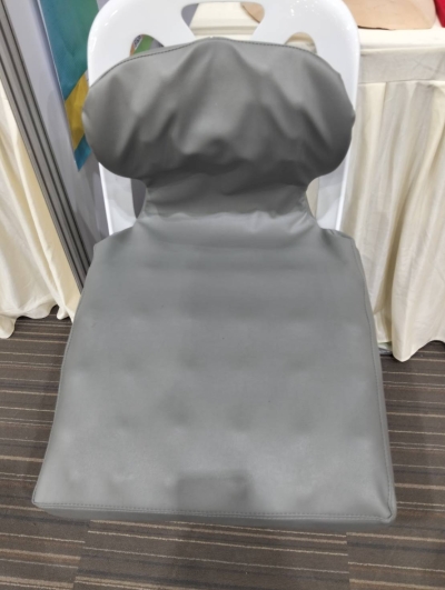 สารเคมีสำหรับยางแล้วปรับปรุงสูตรน้ำยางคอมพาวด์ ให้มีความหนาแน่นที่เหมาะสม เหนียว และนุ่ม และใช้หลักการกระจายน้ำหนัก ออกแบบเป็นปุ่มนูน มีขนาดความกว้างและยาวที่พอเหมาะในการรับสะโพกและต้นขา โดยที่ความกว้างของที่นั่งมีความกว้าง480-600 มม. ต่อหนึ่งคน เพื่อให้เกิดพื้นที่สำหรับการเคลื่อนไหวได้อิสระ โดยขนาดที่นิยมใช้ในเอเชียคือ 480-550 มม. |