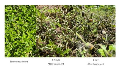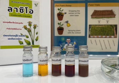 ในผลผลิต รวมถึงส่งผลกระทบต่อสิ่งแวดล้อม และทำให้วัชพืชต้านทานสารเคมี การจัดการวัชพืชโดยชีววิธีที่ใช้จุลินทรีย์มีข้อจำกัดเรื่องประสิทธิภาพและการใช้งาน จึงมีการพัฒนาเทคโนโลยีชีวภัณฑ์กำจัดวัชพืช โดยใช้สารชีวภาพจากรา Lasidioplodia ร่วมกับสารเสริมประสิทธิภาพจากแบคทีเรีย ทำให้สามารถลดปริมาณการใช้สารสกัดหยาบจากเชื้อราได้ โดยชีวภัณฑ์นี้มีความเข้มข้นและประสิทธิภาพใกล้เคียงกับกลูโฟซิเนตแอมโมเนียมในตลาด มีความปลอดภัยต่อคนและสัตว์ ออกฤทธิ์แบบดูดซึมและสัมผัสตาย ควบคุมวัชพืชใบกว้างได้อย่างมีประสิทธิภาพ โดยมีวิธีใช้โดยการฉีดพ่นที่ความเข้มข้น 5 มก./มล. เพียง 1 ครั้ง สามารถควบคุมวัชพืชใบกว้างได้ผลตั้งแต่ 6 ชั่วโมงหลังฉีดพ่น และควบคุมได้อย่างสมบูรณ์ภายใน 7 วัน |