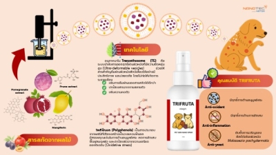 ผลิตภัณฑ์สเปรย์ทรานส์เอทโธโซมสำหรับผิวหนังสัตว์เลี้ยงที่ผสานสารสกัดจากพรุน ทับทิม และมะม่วง ภายใต้ชื่อ TRIFRUTA เป็นผลิตภัณฑ์ที่ช่วยเพิ่มการซึมผ่านของสารสกัดได้อย่างมีประสิทธิภาพ ส่งผลให้ฤทธิ์ต้านอนุมูลอิสระ ต้านการอักเสบ และการยับยั้งเชื้อยีสต์ Malassezia อีกทั้ง ยังมีจุดเด่นด้านเทคโนโลยีการผลิตที่มีความเรียบง่าย ไม่ซับซ้อน และสามารถเพิ่มกำลังการผลิตได้ทันทีโดยไม่ต้องลงทุนเครื่องจักรใหม่เพิ่มเติม นอกจากนี้ ผลิตภัณฑ์ยังผ่านการทดสอบในห้องปฏิบัติการกับเซลล์ พบว่ามีความปลอดภัย และช่วยการอักเสบได้